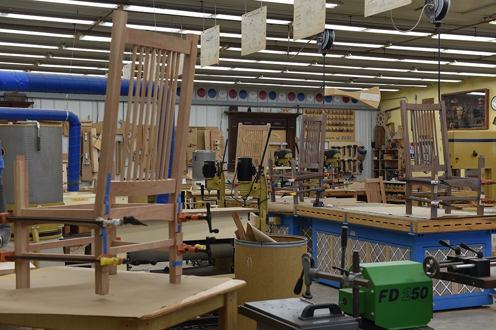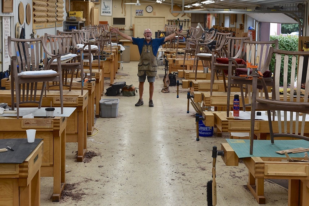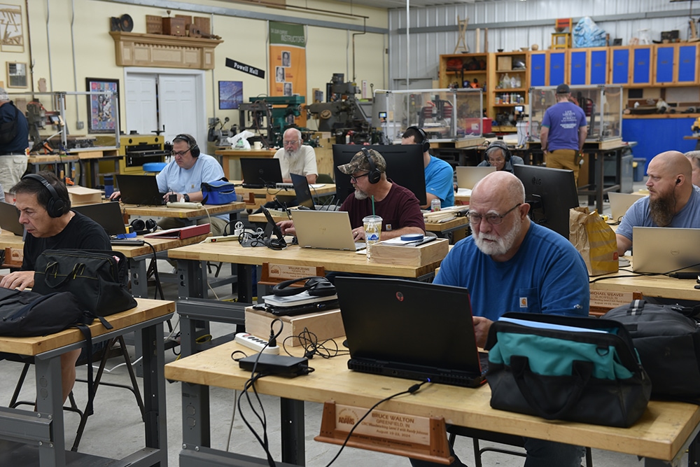 At each instructor’s bench, there is a state-of-the-art digital camera system that brings students closer to the action. A specially designed sound system is available for those who have a difficult time hearing during class lectures. Each student has his or her own custom-made Lie-Nielsen workbench and a padded stool on which to sit. There are cushioned mats that eliminate the stress of standing on concrete all day.