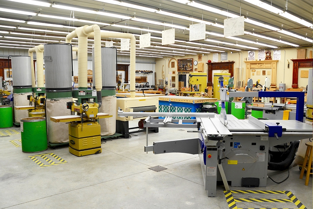The shop has plenty of power tools and even more hand tools to aid in the learning process. Each tool room offers plenty of workspace, along with a variety of well-maintained equipment.Â