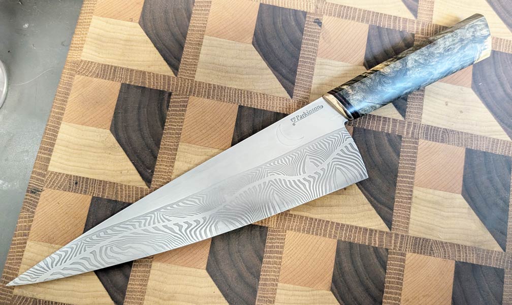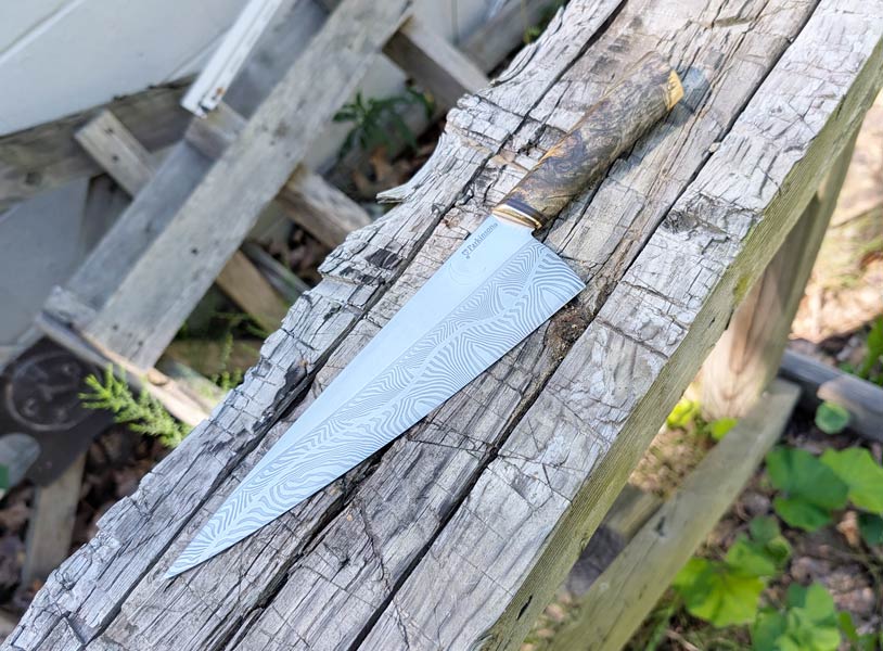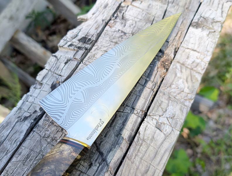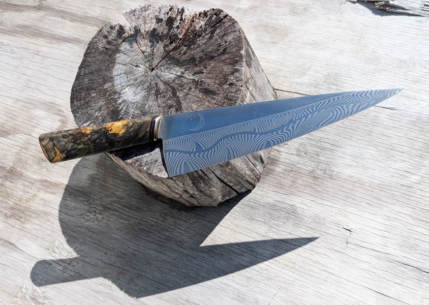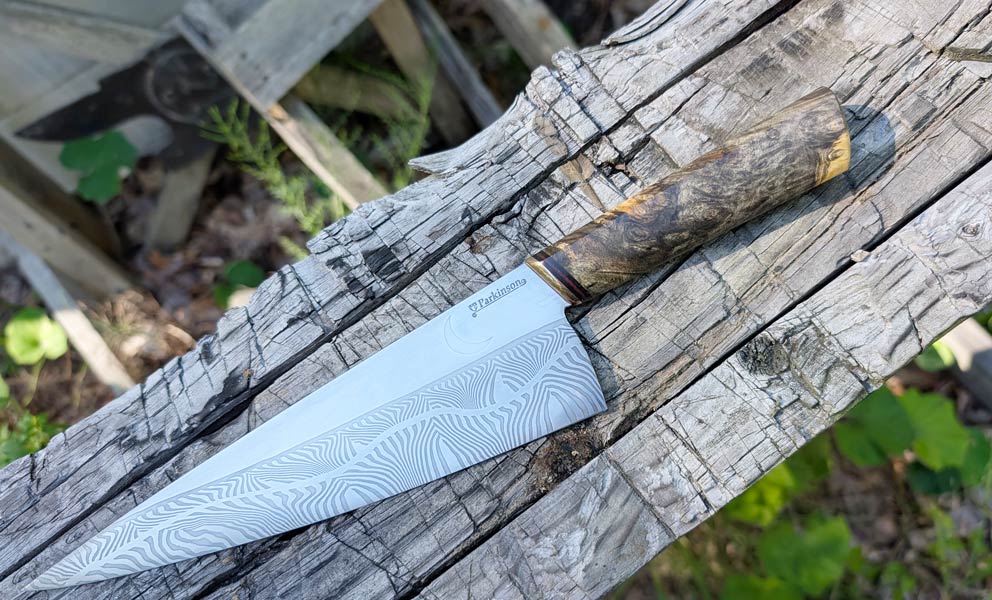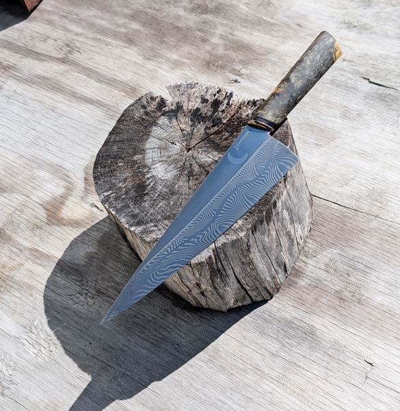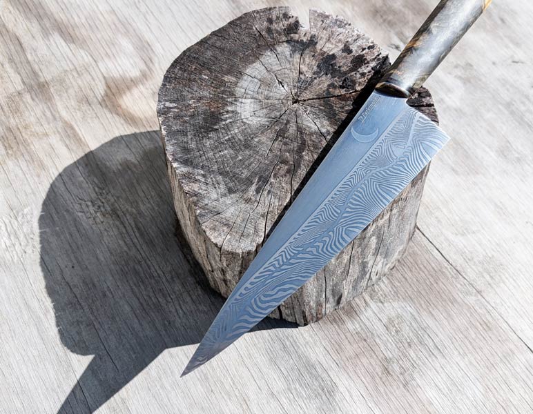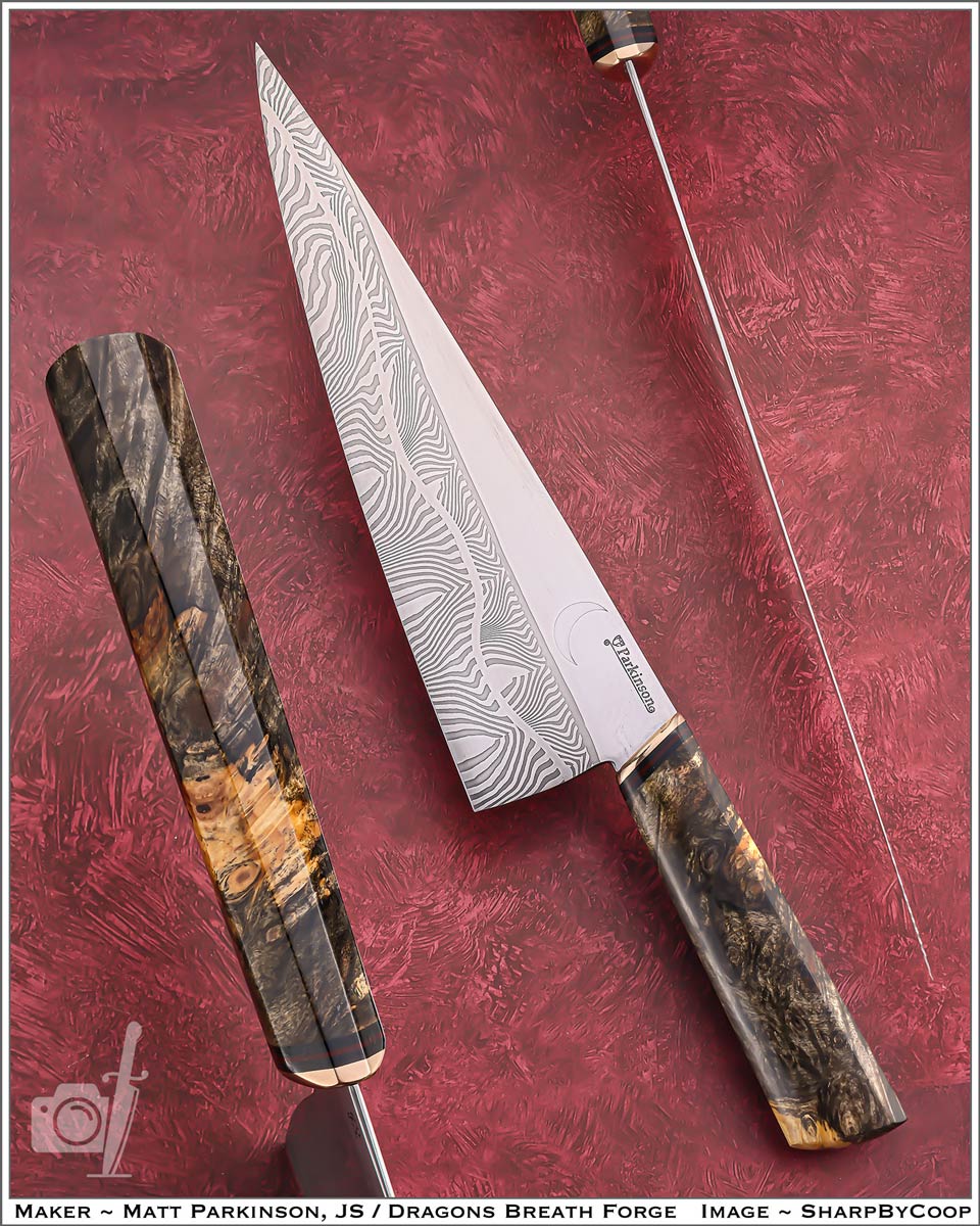 The blade was created through a technique called pattern welding. Starting with a 36 layer billet of 15n20 and 1084 forged into two sizes of bar cut into tiles and welded to place the engraving on the face of the blade. These two bars, with an additional bar of 15n20 or 1084 along one edge was then welded to a field of 15n20 and split into three billets. The moon was shaped out of 1045 steel and welded in. The blade was then carefully hand forged to shape, heat treated, ground, and polished. It was then etched and repolished to reveal the pattern. The handle is constructed of a polished silicon bronze bolster followed by G10 spacers and a stabilized Buckeye burl handle.” ~ Matthew Parkinson, JS