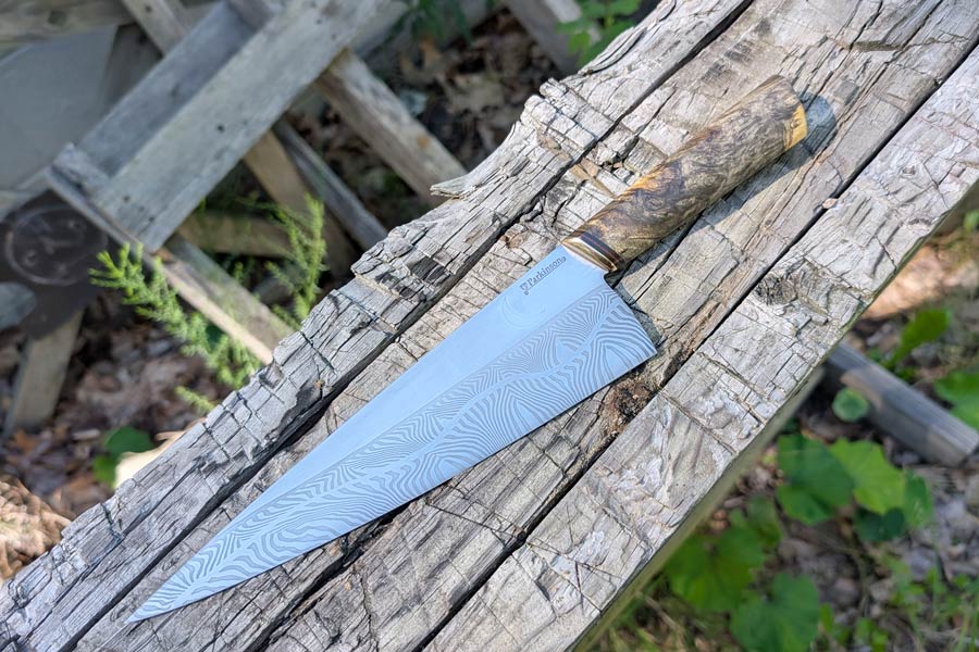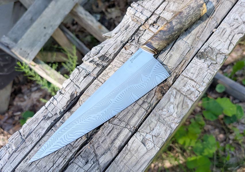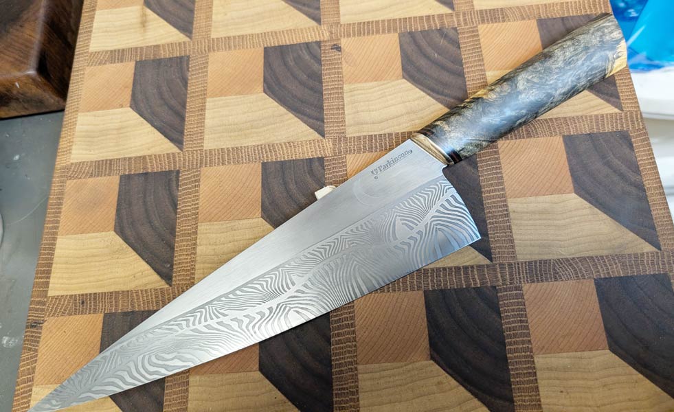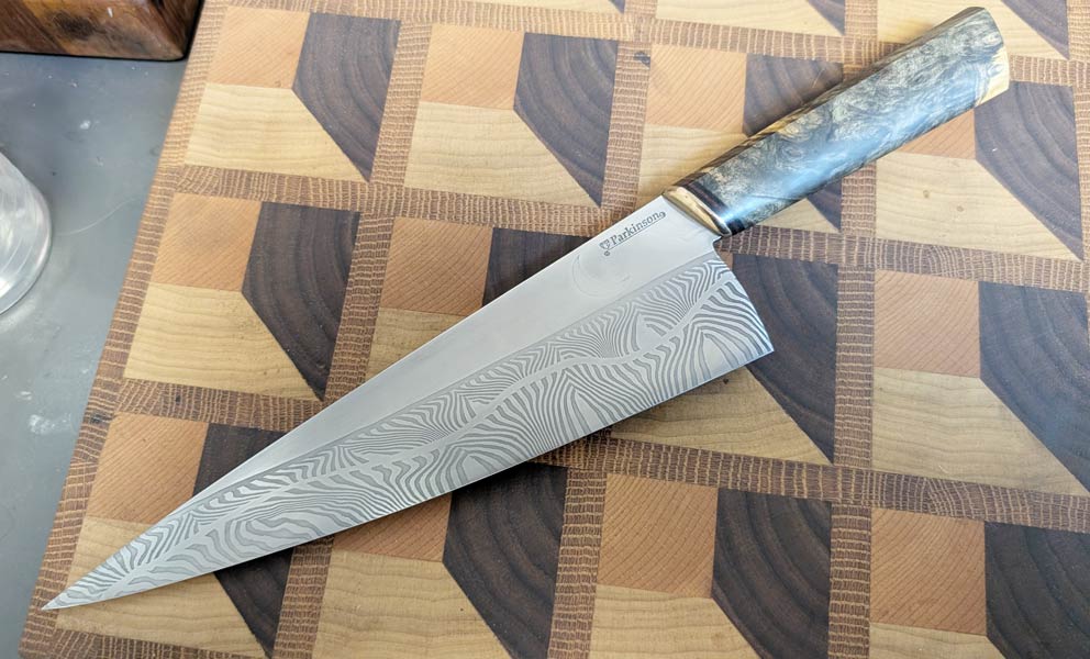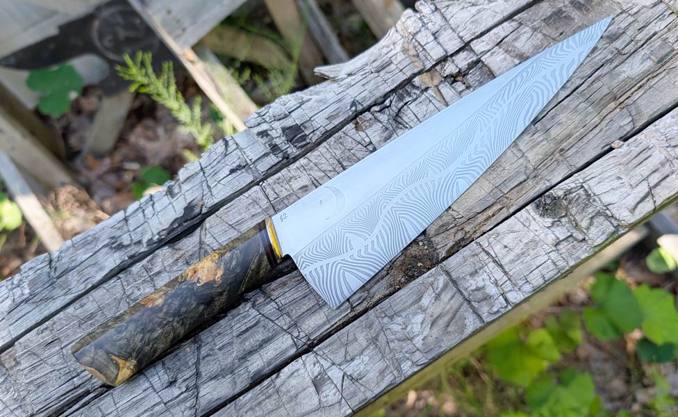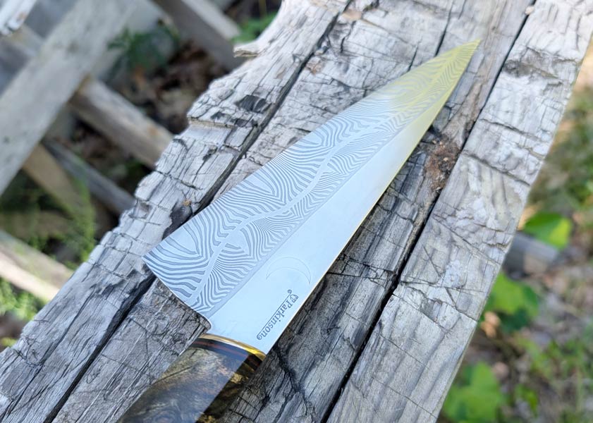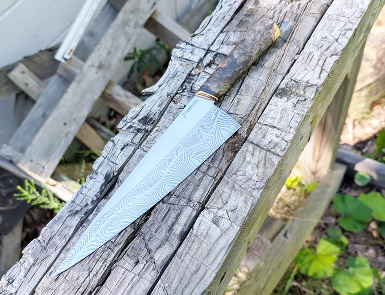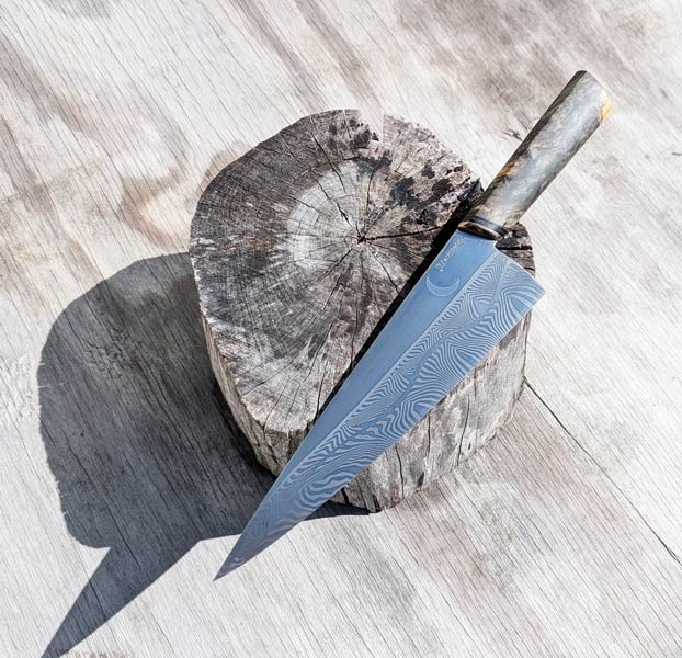 The blade was created through a technique called pattern welding. Starting with a 36 layer billet of 15n20 and 1084 forged into two sizes of bar cut into tiles and welded to place the engraving on the face of the blade. These two bars, with an additional bar of 15n20 or 1084 along one edge was then welded to a field of 15n20 and split into three billets. The moon was shaped out of 1045 steel and welded in. The blade was then carefully hand forged to shape, heat treated, ground, and polished. It was then etched and repolished to reveal the pattern. The handle is constructed of a polished silicon bronze bolster followed by G10 spacers and a stabilized Buckeye burl handle.” ~ Matthew Parkinson, JS