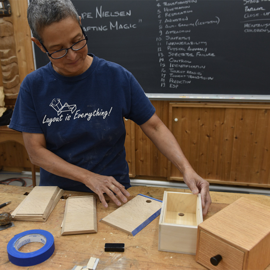 This class is an introduction to the world of magic boxes and magicians. For centuries, magicians have been using magical apparatus to create all sorts of effects: vanishes, appearances, transpositions, transformations, restorations, and much more. In this class, students will make two magic boxes using several basic principles. One of the boxes (called a Drawer Box) will involve using a double drawer that allows items to vanish, appear, or transform an object. This box dates to 1876 when its principle was first published in Hoffman’s Modern Magic. A second box will involve the use of a mirror to hide its contents and make it appear empty. If there is time, students will work on another box made for a specific magic trick, which Lupe will reveal in the class. These boxes are examples of fully working professional magic props. At the end of the class, everyone will have at least two finished magic trick boxes that will make excellent conversation pieces and could be used to amaze and amuse their friends.