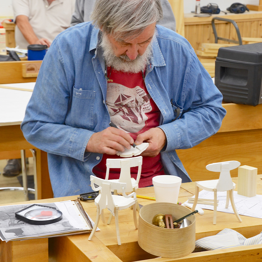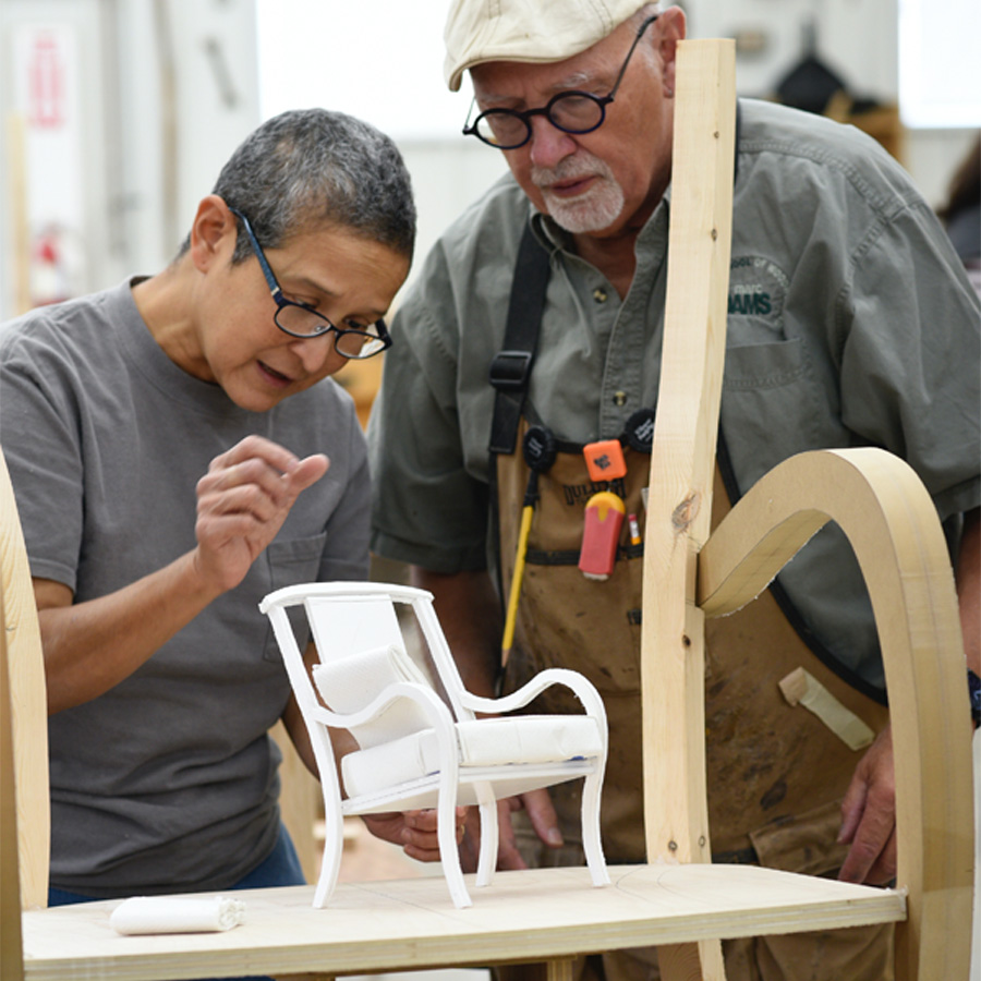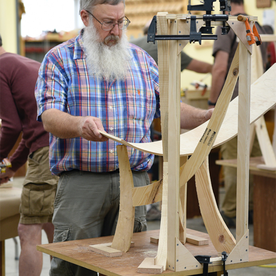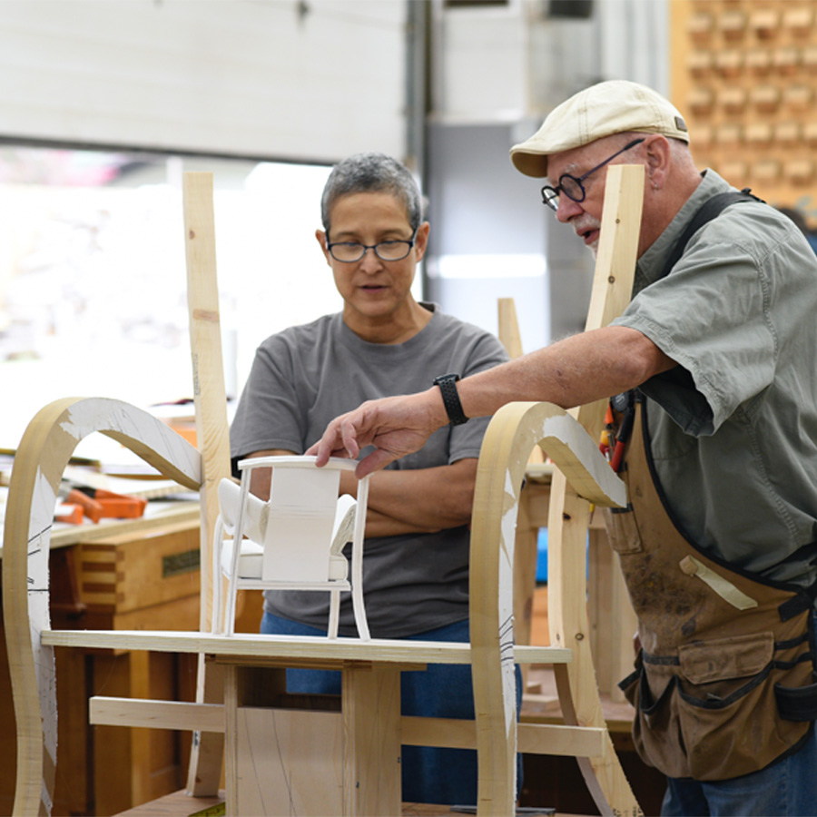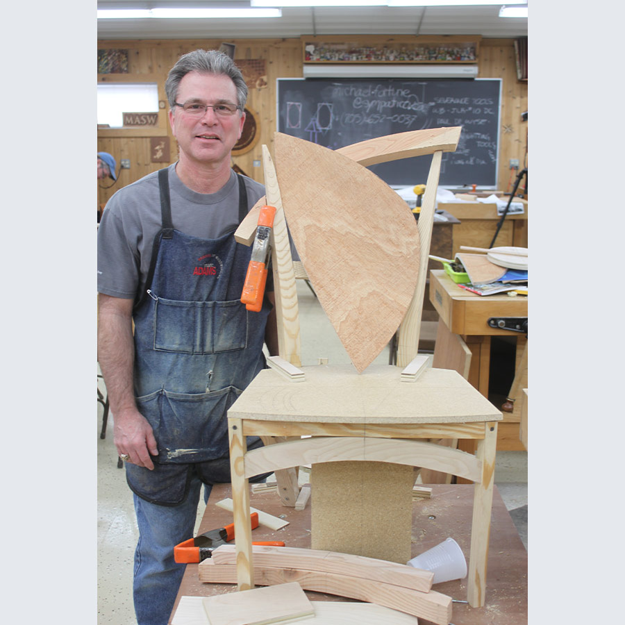 This workshop is an intensive investigation into the design and construction of dining or desk chairs. Making a unique, comfortable, strong, and attractive chair is a wonderful challenge considered by most to be the pinnacle of woodworking prowess. This course will give you both the anthropometric data (critical human dimensions) required to design comfortable chairs and a simple and effective step-by-step approach to successfully building chairs, even if they incorporate compound curved members and seemingly complex joinery. You will develop your own chair designs with Michael’s guidance during the class and then fabricate a full-size mockup that can be sat in and evaluated. Demonstrations on making scale models, full-size mockups, and jigs for chairs will take place throughout the week. Straightforward methods of upholstering chair seats and backs are also covered. Michael brings examples of several chairs he has made during his 30-year career in woodworking, discusses what inspired the designs, and explains how he employs an organized sequence of jigs to fabricate his chairs. The history of chairs is covered in a slide presentation.