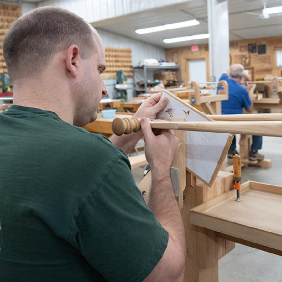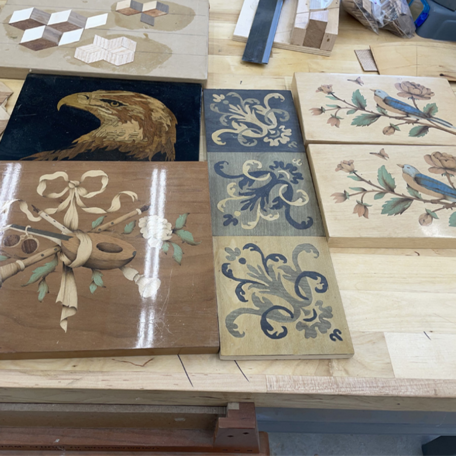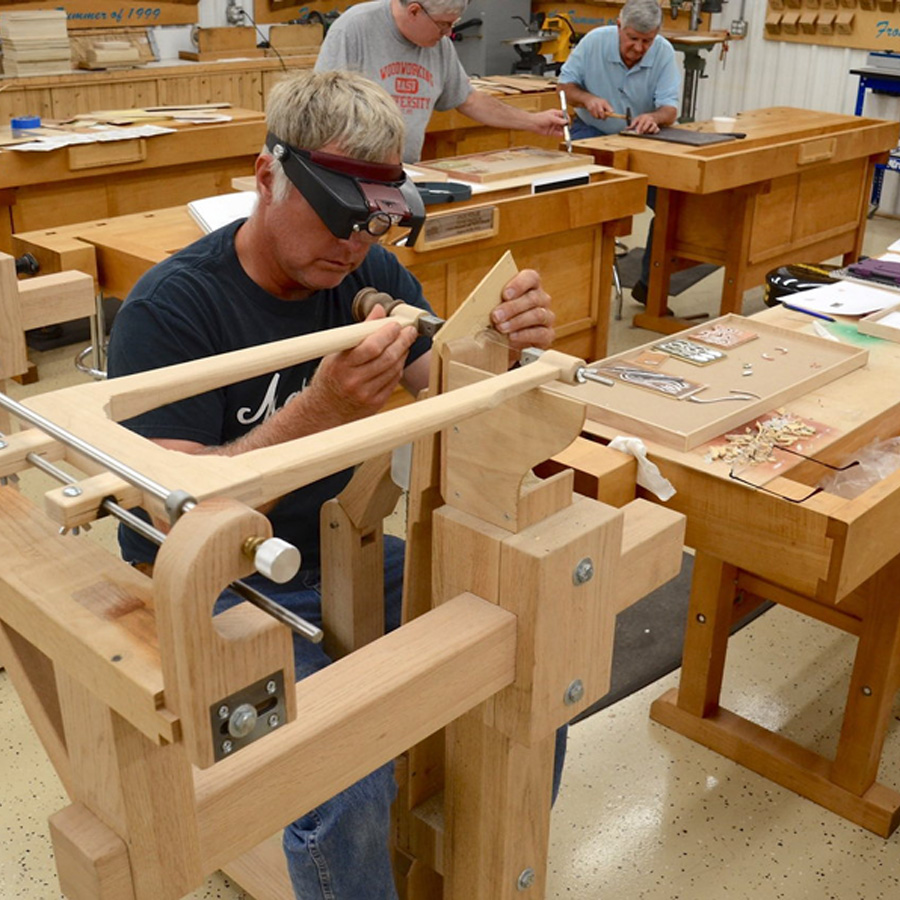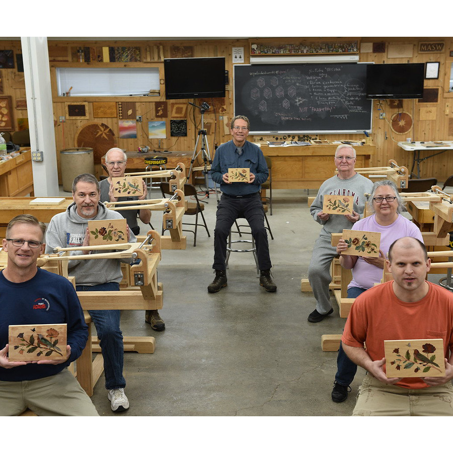 From the late 17th century to the start of the Industrial Revolution, France led the rest of Europe in the development of extremely decorative and complex marquetry decoration, which allowed them to create the finest examples of furniture ever made. The epicenter of this trade was Paris, where a special cutting tool was perfected and kept secret: the “Chevalet de Marqueterie,” often translated into English as “donkey.” This tool, made of wood, allowed the worker to sit in comfort, use his feet to easily clamp the work, and cut the designs out of packets of veneer with amazing accuracy. This class will introduce the student to the chevalet as well as the traditional method used to create elaborate marquetry designs, referred to in the 17th century as “painting in wood.” Students will begin with a simple etude or project, which will allow them to learn how to operate the tool. In addition, the first project will demonstrate how a simple marquetry packet is assembled, what is the proper sequence for cutting Boulle designs, how to tension the blade properly in the tool, and how to keep track of the parts. Those who feel confident in their ability to cut accurately with the chevalet will be provided with an entry-level piece-by-piece project. Those who need more practice will be provided with a painting-in-wood project. The process of designing will be discussed, as well as selecting woods and assembling a veneer packet. In addition, the proper method of cutting out and keeping the pieces in correct order will be taught. Making an assembly board and using hot hide glue to put the project together is an essential part of this class. Mixing mastic and gluing the marquetry to the final project will be done by each student. The final lesson is how to remove the paper from the face of the marquetry and clean it up for proper finishing.