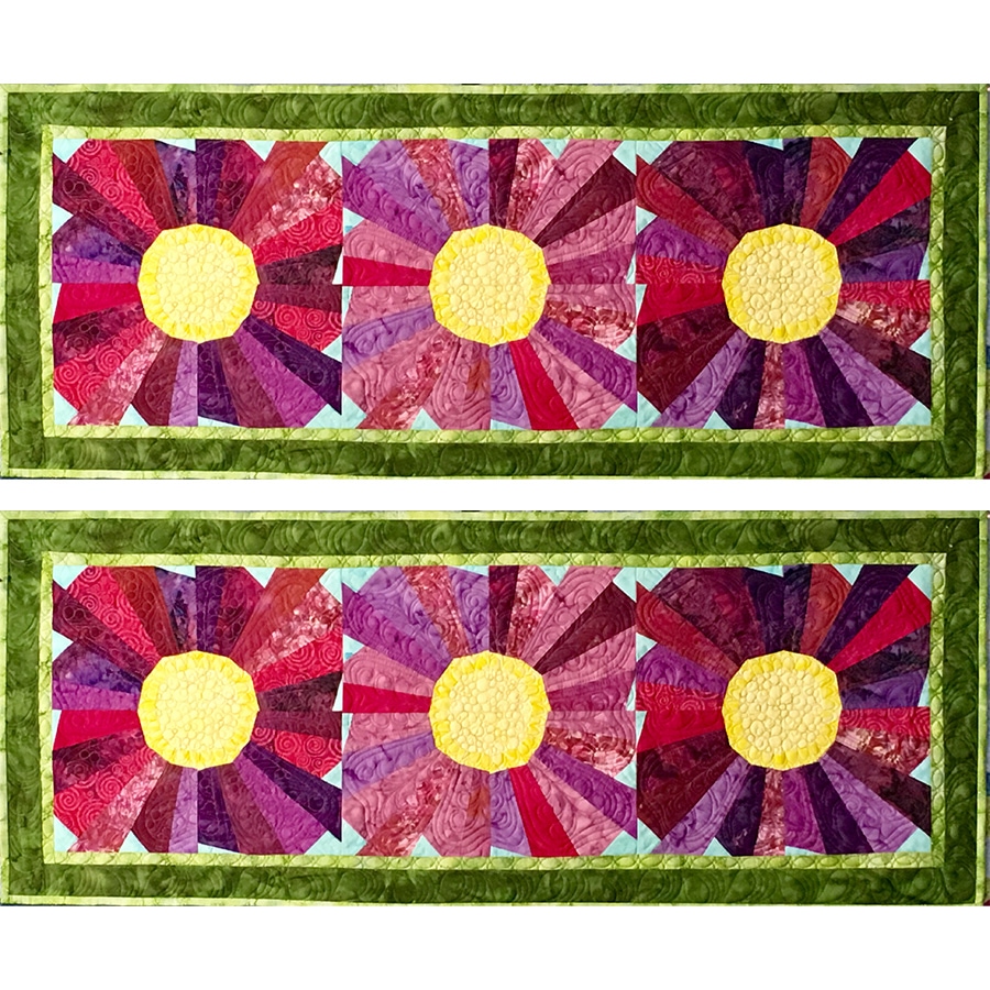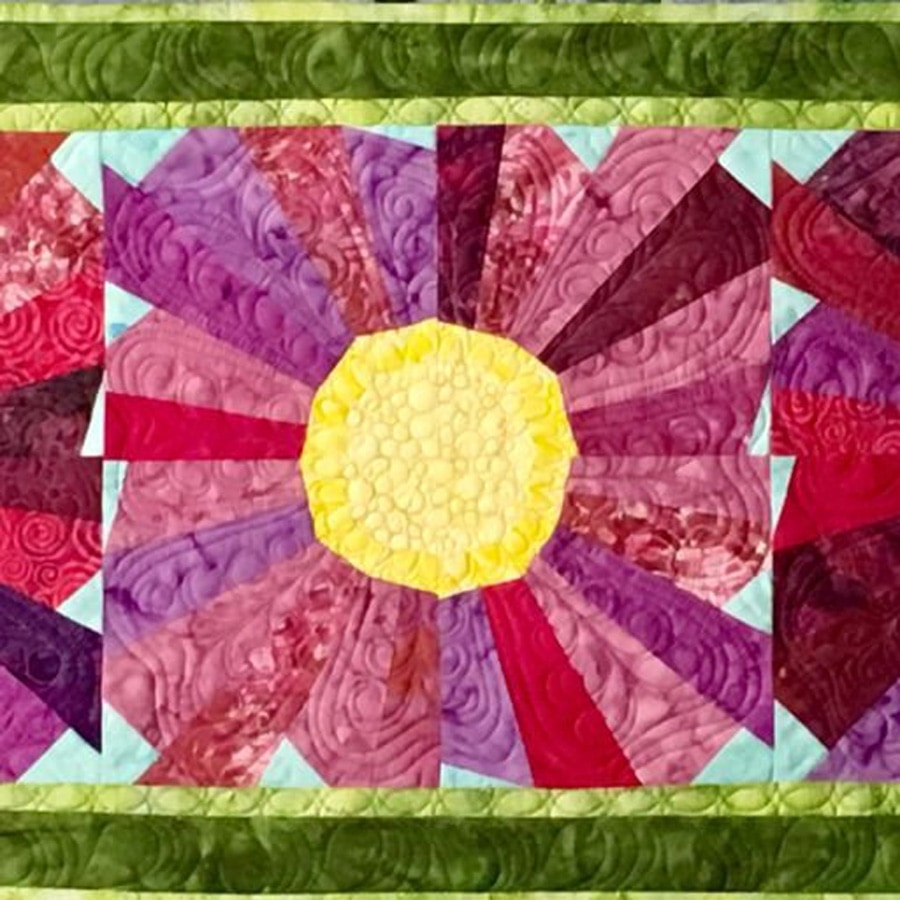 Have you ever wanted to achieve perfect points in your quilts without having to pull out all the little shards of paper you get using the paper piecing method? In this class, Cheryl will teach students how to use freezer paper templates to get all the accuracy without all the tedious paper picking and wasted fabric. Cheryl will demonstrate how to prepare the pattern templates from a master pattern, how to rough cut pieces, and best practices for stitching, pressing, and matching seams. Cheryl has chosen a very simple flower pattern that can be made into a table runner for this class. The pattern also includes instructions for the 52” x 69” Hollyhock quilt. Perfect piecing is at your fingertips!