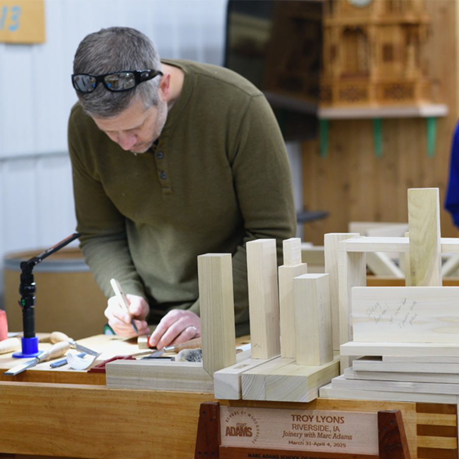 It’s a general rule that the weakest part of any furniture piece is at the joint. No matter what your skill level, this class will change the way you approach all your projects. Students start by learning the actions and terms of many common joints, the elements of a joint, and how to select the best joint for the job at hand. There will be a special presentation on adhesive selection, sharpening, and tuning your tools. This class will help students develop hand and machine skills. Although this is not a project-oriented class, each student will go home with a sack full of cut joints that can be used as examples for years to come. Marc begins by teaching the layout process. Students gain confidence and learn that if they can lay it out accurately and cut to the line, any joint is possible. By the end of the week, you will be a joinery wizard. Each student works at his or her own pace, learning how to cut dovetails, half-blind dovetails, lap dovetails, sliding dovetails, decorative dovetails, mortise and tenons, angled mortise and tenons, three-way miters, scarf and hip joints, decorative joints, and the joinery system used for carcass construction in cabinetmaking. You will be given a daily challenge-and Marc knows that you will succeed. This is the most popular class offered at the school, so make sure to sign up early.