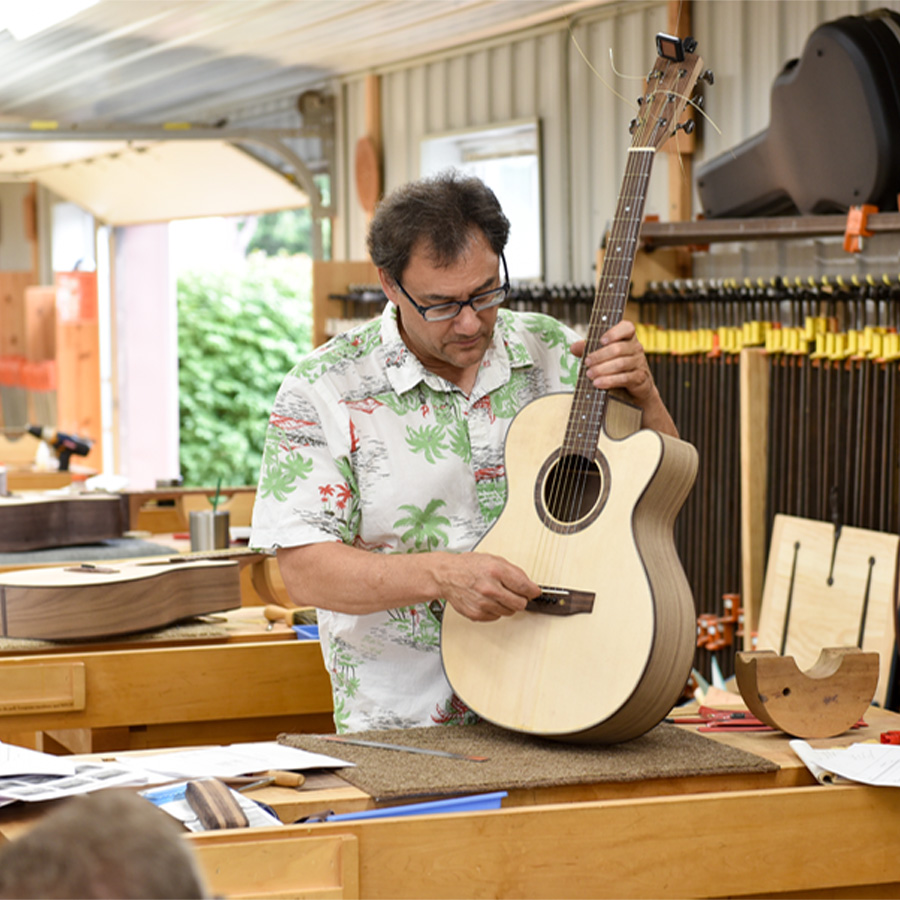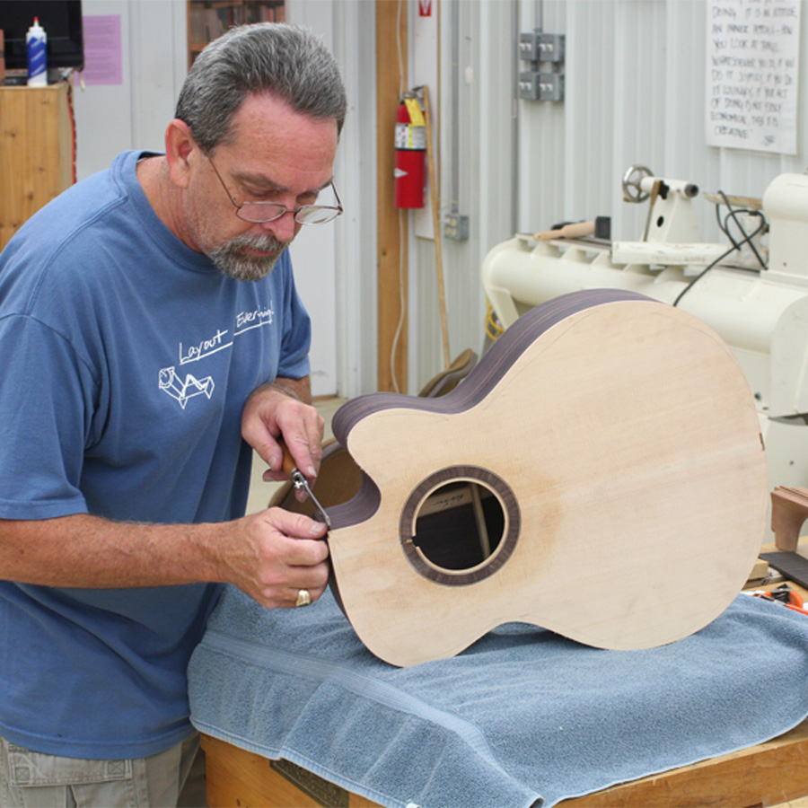 Take your guitar building to the next level by adding custom details to your project. This is an advanced guitar building class in which you will learn to build a Venetian (bent) cutaway guitar, using walnut or sapele back and sides with spruce tops. You will be bending your own sides in class and fitting them to the form, as well as carving your own neck. The challenges in binding the cutaway area, as well as fitting the neck, will be covered in detail. All materials to complete the guitar will be provided. This class will expand your thinking of traditional guitar designs and methods and will jump-start you to creating your own unique guitar design. Some guitar building experience, or a high level of woodworking skill would allow you to get the most out of this class.