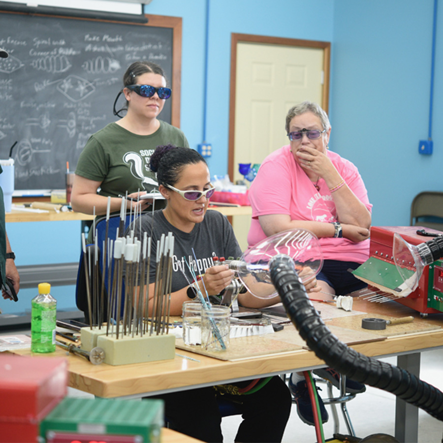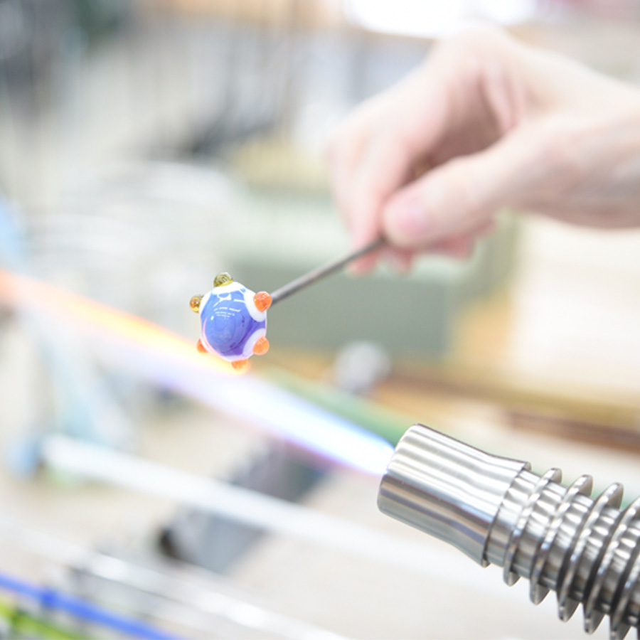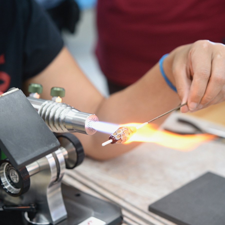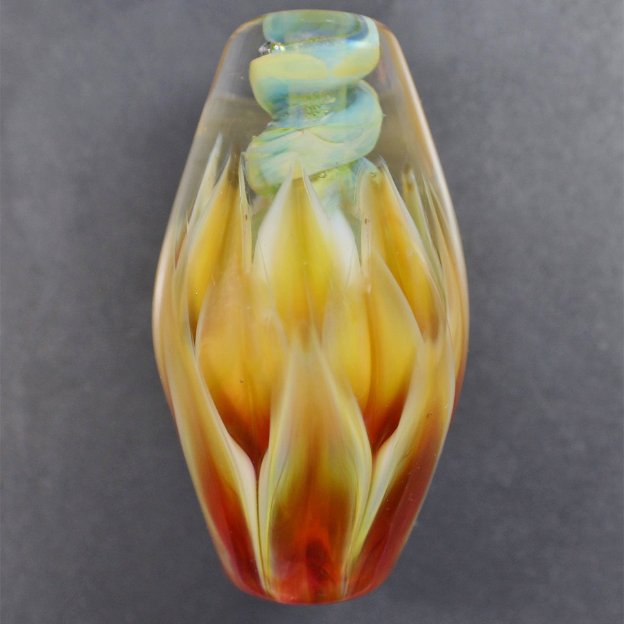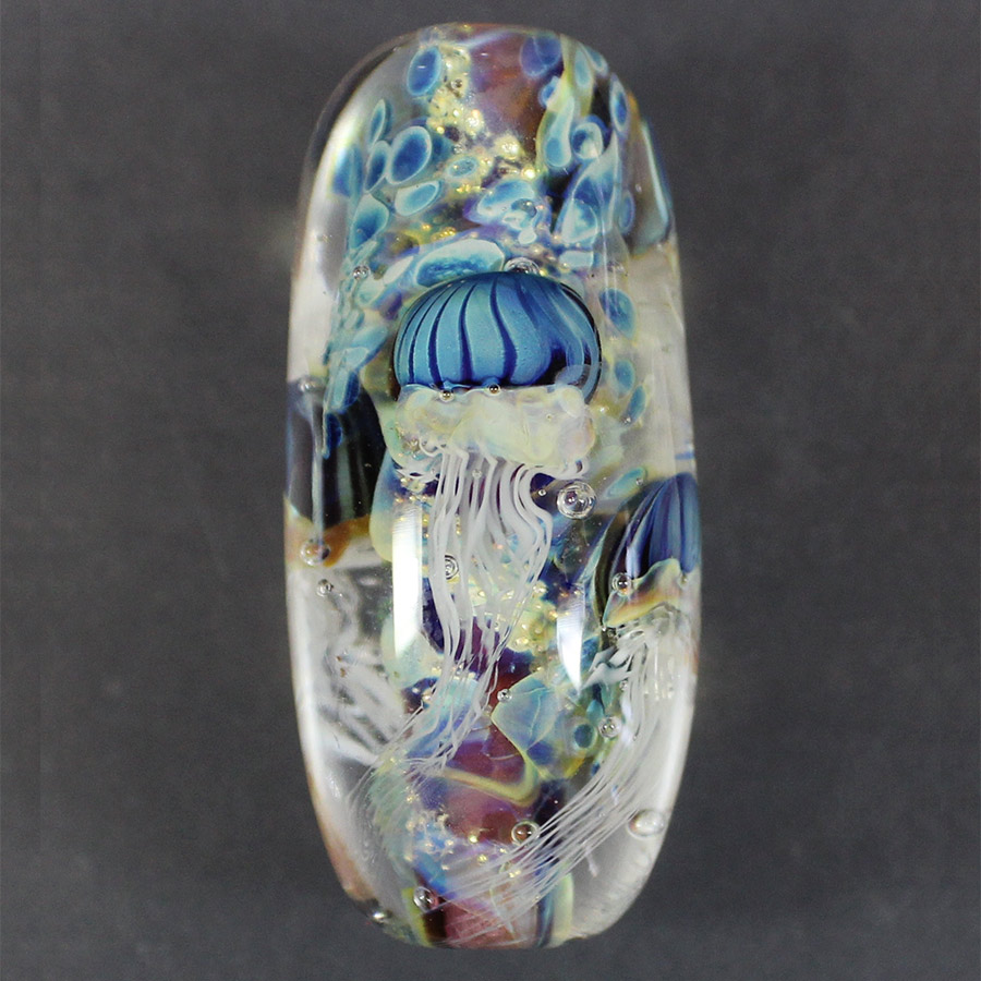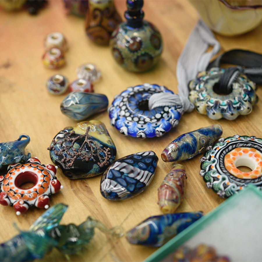 This workshop is open to all skill levels. The curriculum will be tailored so that each student can move at their own pace according to their skill level; beginner, intermediate and advanced techniques will be demonstrated. Leah will begin with an overview of the flameworking (also called lampworking) process including studio safety and set up. Day one will focus on petal inspired beads and pendants using a variety of dot placement and encasing techniques. On the second day students will learn how to create encased floral landscapes. Day three will begin with pulling cane and making murini to incorporate into the jellyfish creations. On day four students will have the option to keep practicing the skills they’ve learned or dive into the world of glass implosions and encasing techniques to create beautiful 3 D blossoms. Day five will be a day to practice and fine tune skills and receive further assistance on anything students might be struggling with. Students will have the opportunity to request demonstrations beyond those planned for the class throughout the week. At the end of the week, students will leave with a variety of glass artworks they’ve created as well as an understanding of what is needed to build a home studio if they don’t already have one.