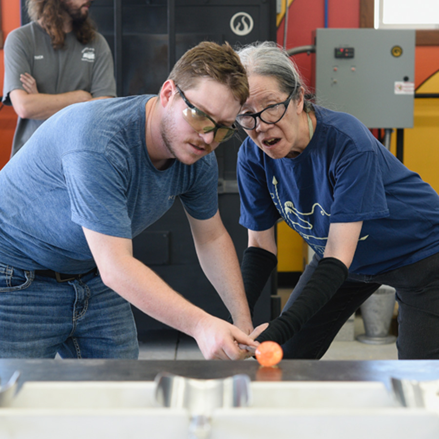 If it is adrenaline you seek, this is the class. This workshop will introduce students to the exciting world of hot glass and offhand glassblowing. In this intensive two-day class, students will get a look back at the history of the studio glass movement, learn the proper use of tools, and, of course, practice hot shop safety. Collaborating in teams of two, students will begin working with molten glass. Starting with the solid form, each student will make paperweights and then progress into blowing glasses, vases, and bowls.