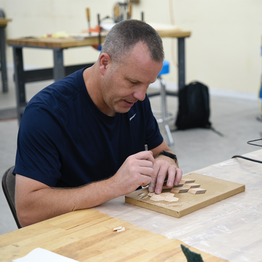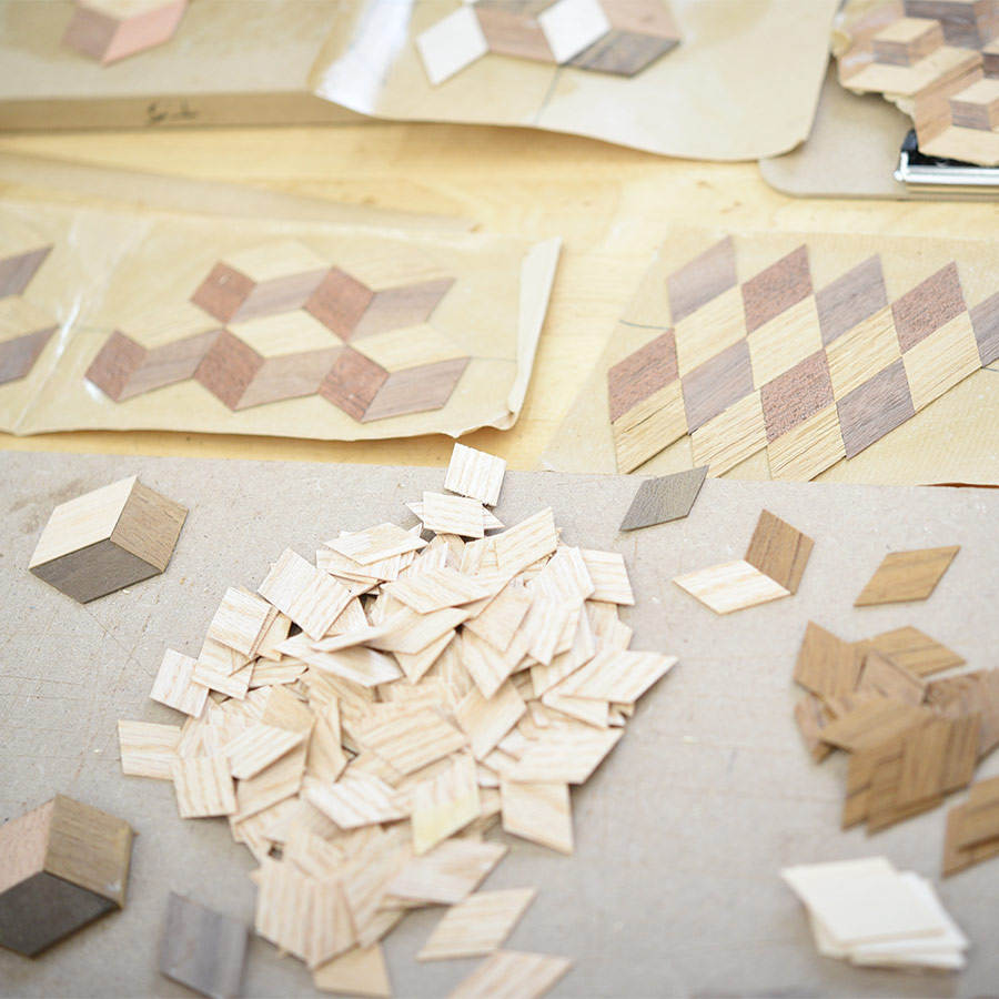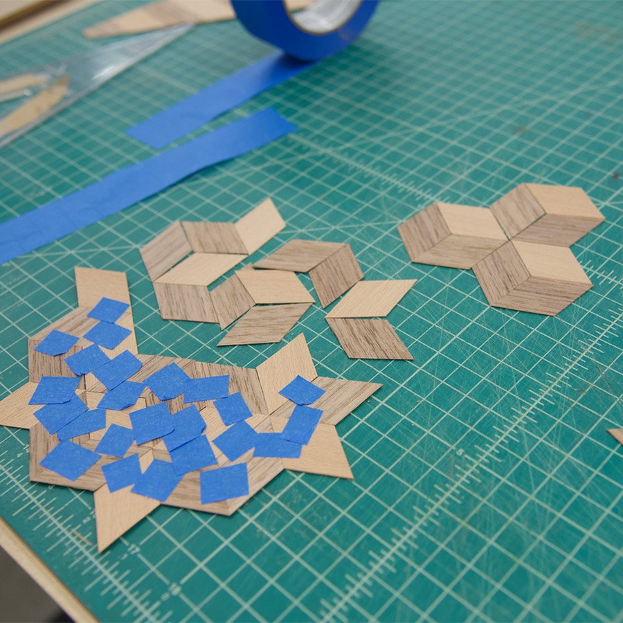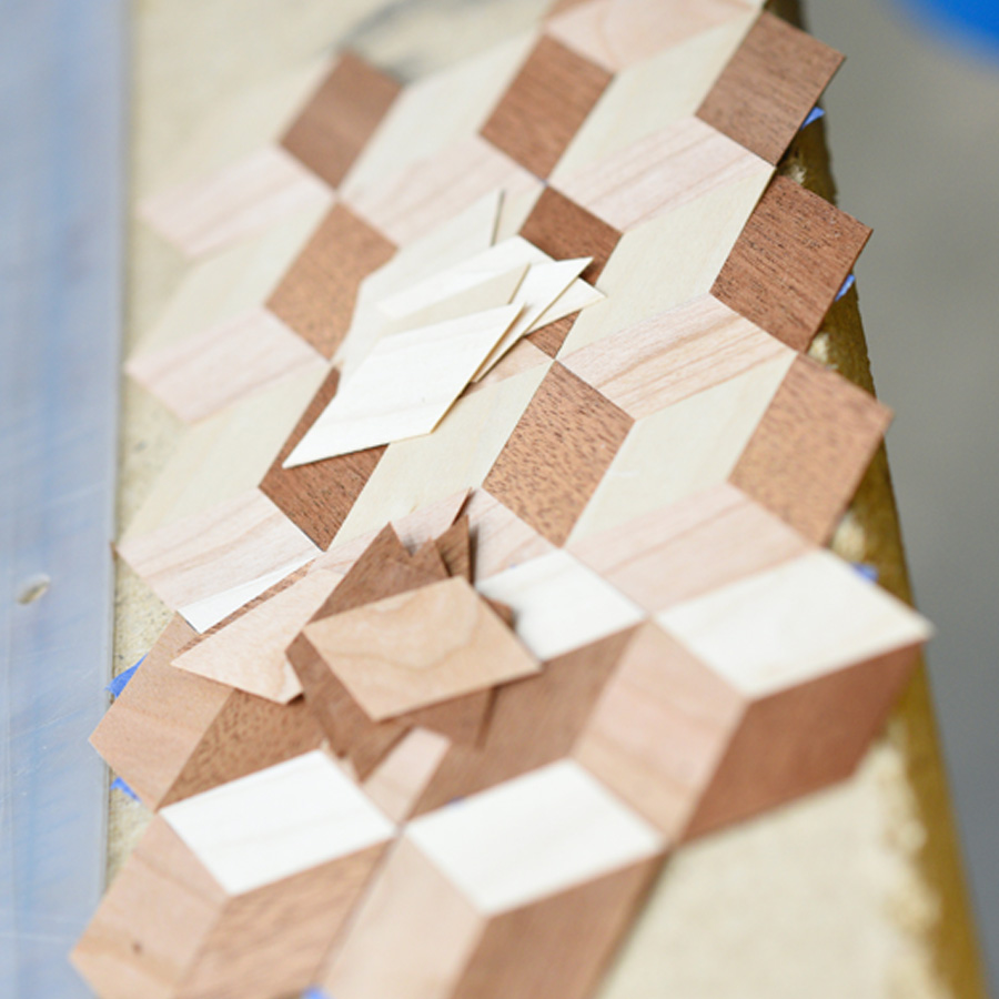- Gluing the marquetry design to the project